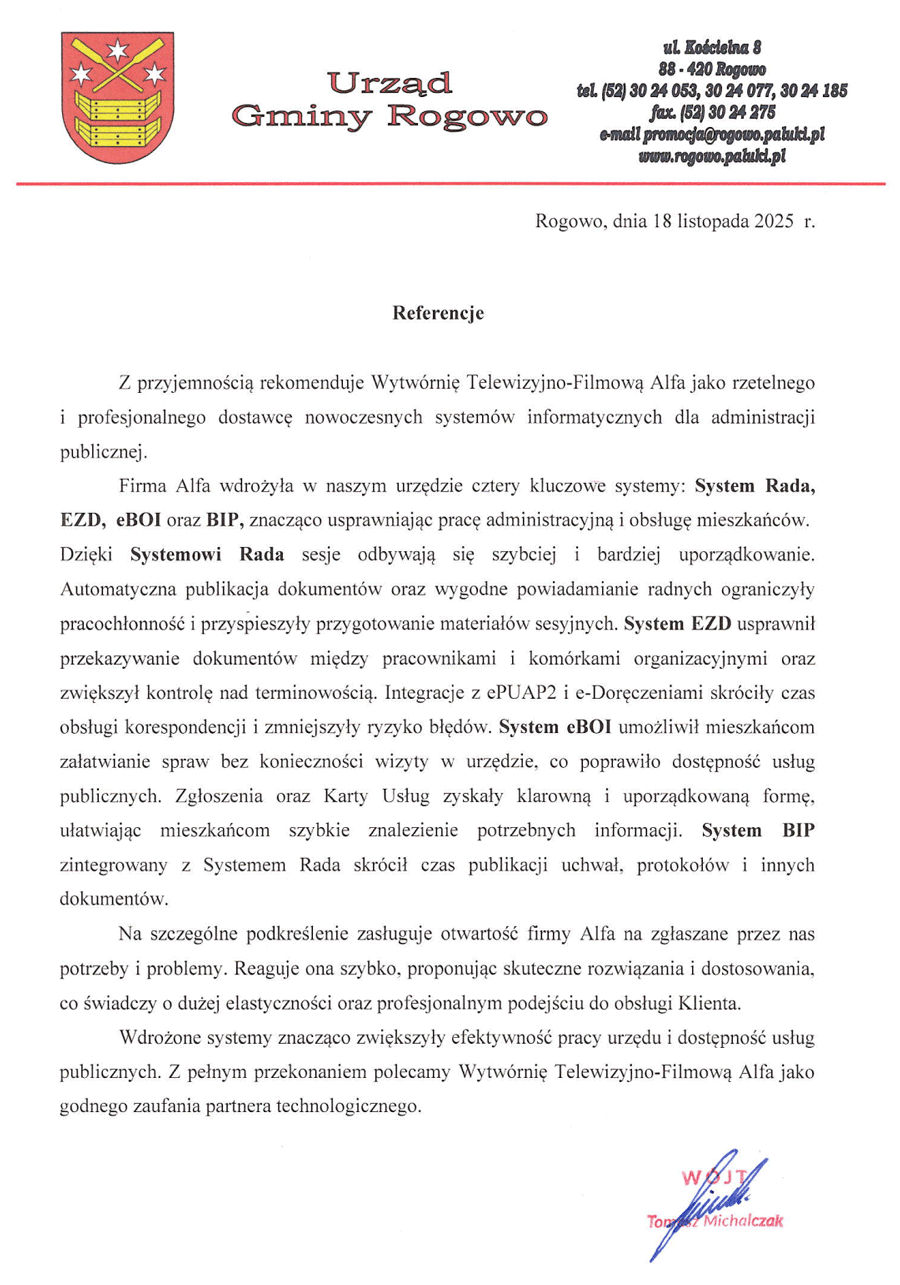 "Z przyjemnością rekomenduję Wytwórnię Telewizyjno-Filmową Alfa jako rzetelnego i profesjonalnego dostawcę nowoczesnych systemów informatycznych dla administracji publicznej"